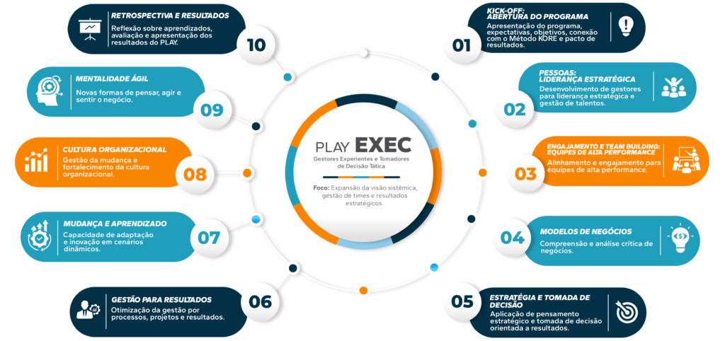 O PLAY Exec é um programa de treinamento avançado voltado para gestores com experiência, que desejam aprimorar suas habilidades de liderança estratégica e aumentar a complexidade e impacto de suas decisões. O curso foca na visão sistêmica do negócio e no desenvolvimento de equipes de alto desempenho.